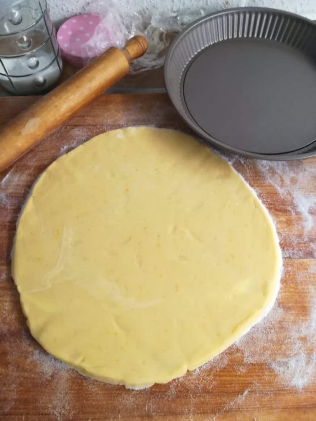 Ha valamilyen oknál fogva mégsem sikerülne kinyújtani, akkor egyszerűen tegyük a tésztát a piteformába és egy pohár aljával, illetve a széleinél a kezünkkel nyomkodjuk formára. Arra figyeljünk, hogy nagyjából egyforma vastag legyen a tészta mindenhol.