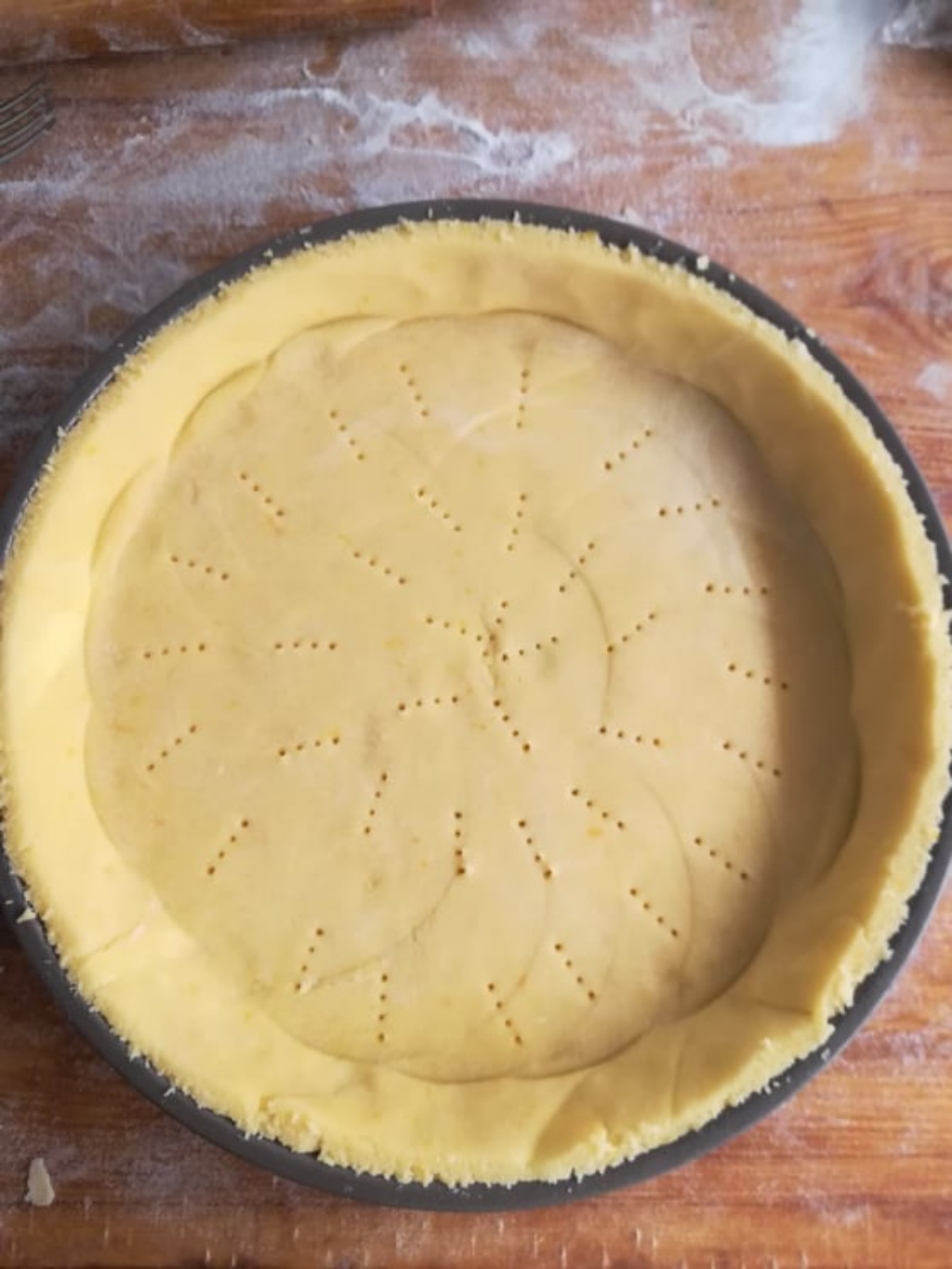 Villával megszurkáljuk az alját, így a gőz el tud távozni és nem púposodik fel. A tésztával így kibélelt piteformát minimum 30 , de inkább 60 percre tegyük be a hűtőszekrénybe, hogy a zsiradék vissza tudjon dermedni.