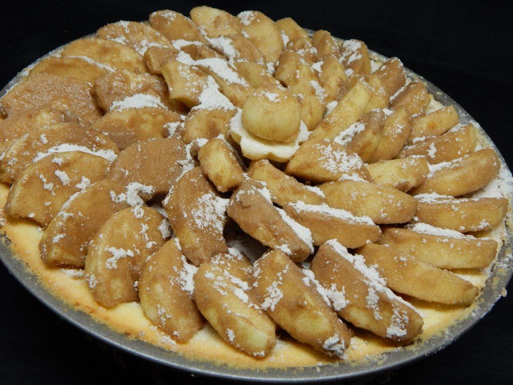A porcukrot a fahéjjal összekeverjük egy tepsiben. Az almákat egyesével meghámozzuk, magházát eltávolítva cikkekre vágjuk, beleforgatjuk a fahéjas porcukorba és elrendezzük az elősütött tésztán. Azért kell egyesével, hogy az első alma ne barnuljon meg ( oxidálódjon ), mire az utolsóval végzünk.