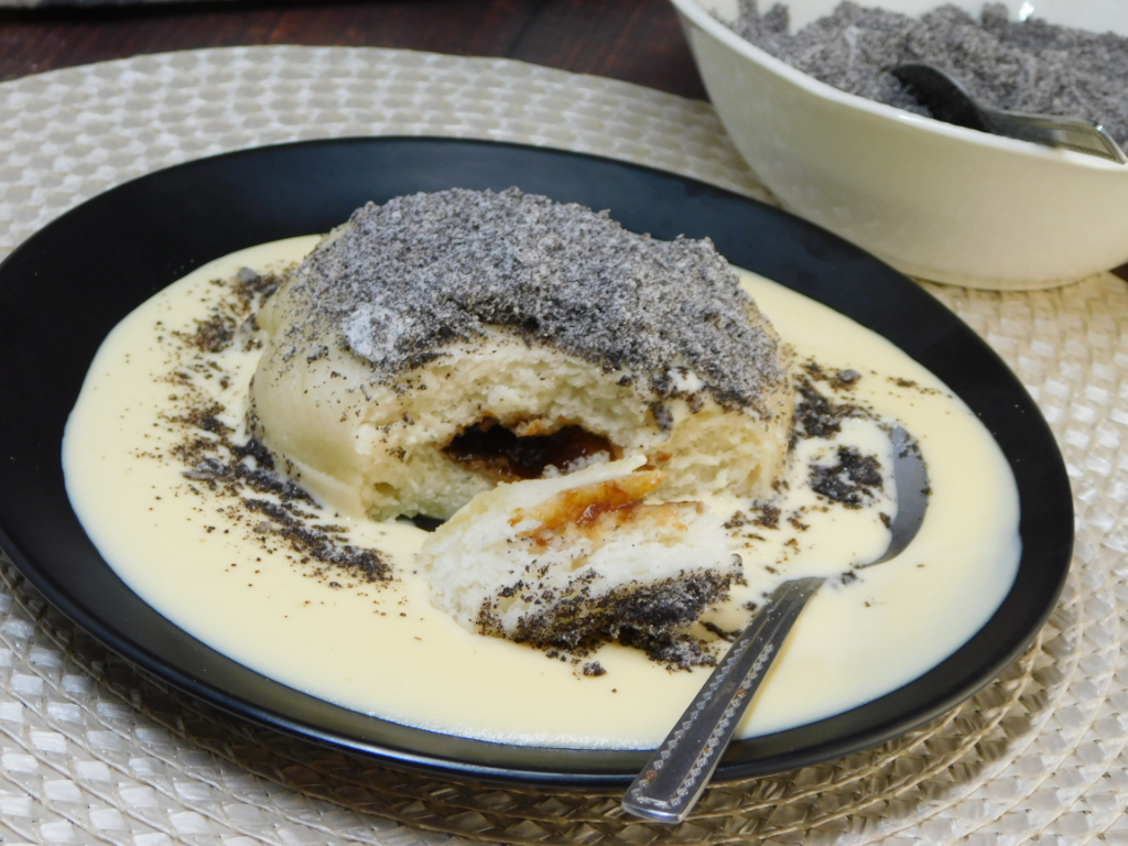 A tányérba szedjünk a vanília sodóból, ültessük bele a gombócot, majd szórjuk meg a mákkal.