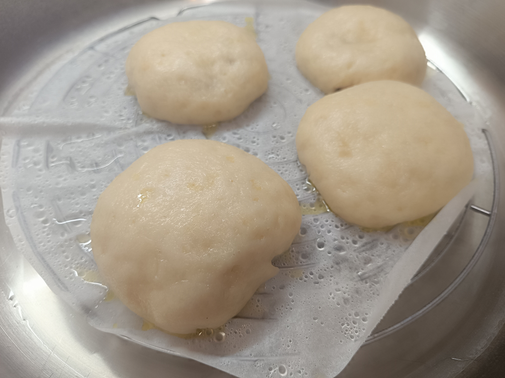 A gőzölőedénybe annyi vizet öntünk, hogy a gombócok majd ne érjenek bele, de az a gőzölés végéig kitartson. Belehelyezzük a tésztaszűrőt vagy egy rácsot és lefedve elkezdjük felmelegíteni a vizet.