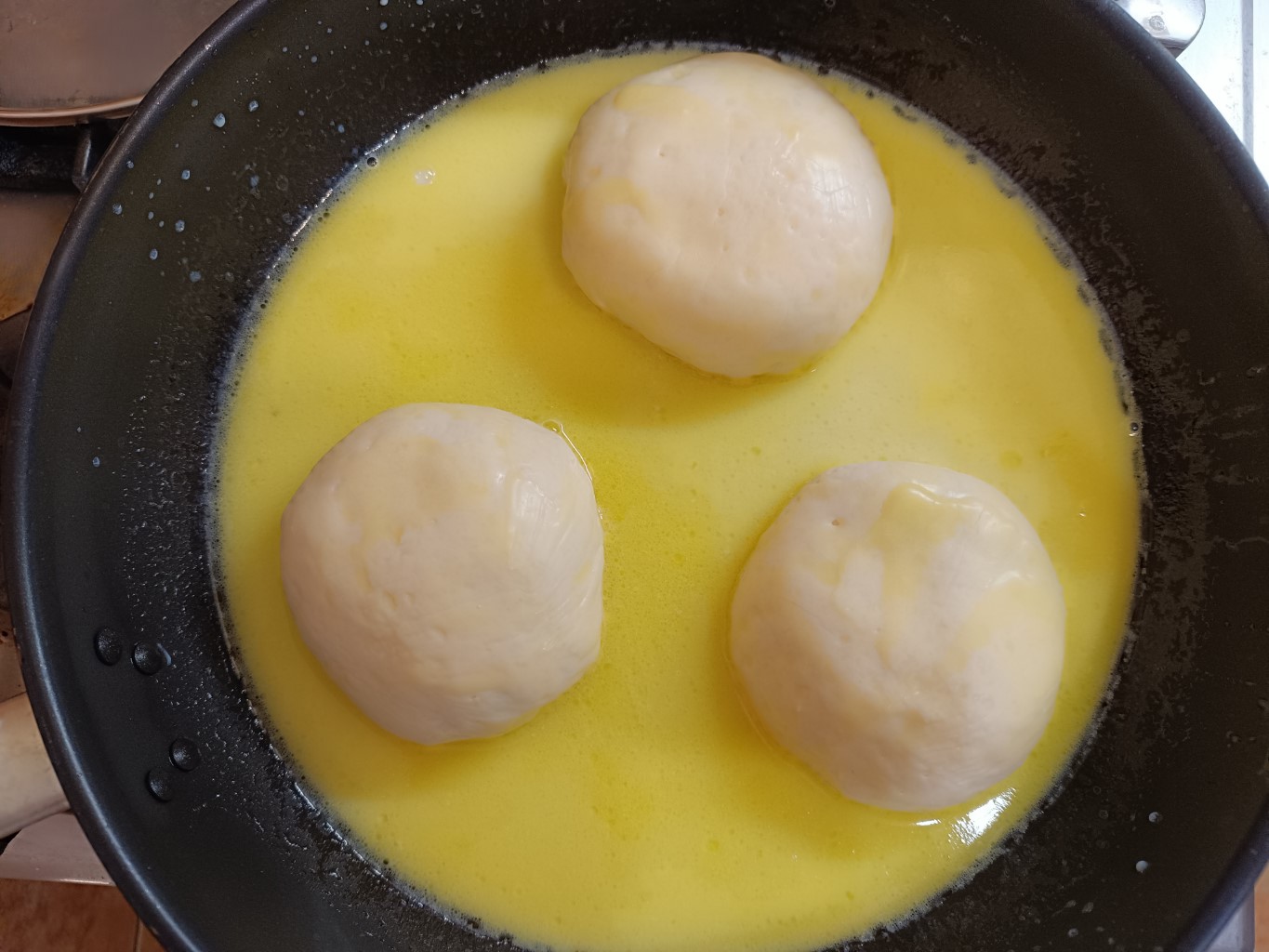 Fedővel rendelkező, tapadásmentes, magasabb falú serpenyőben 100 g tejet, 50 g vajat és 20 g cukrot felolvasztunk. A pihentetési idő lejárta után a gombócokat a forró vajas-cukros tejbe helyezzük, lefedjük és takaréklángon a legkisebb főzőfelületen max. 25 percig pároljuk. A fedőt NE emeljük fel, mert a gombócok összeeshetnek. Óvatosan szedjük őket tányérra és tálaljuk.