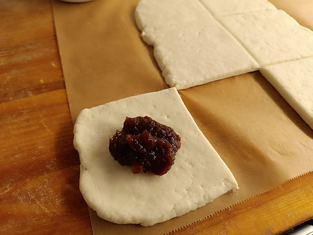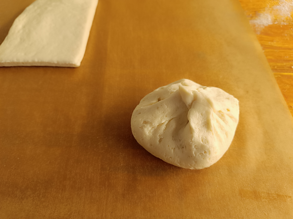 Kiveszünk egy tésztalapot, kézzel kissé megnyomkodjuk, majd 30 gramm ( egy púpos teáskanál ) kikevert szilvalekvárt teszünk a közepére. A széleit összefogjuk, mint egy batyut, majd gombócot formázunk belőle.
