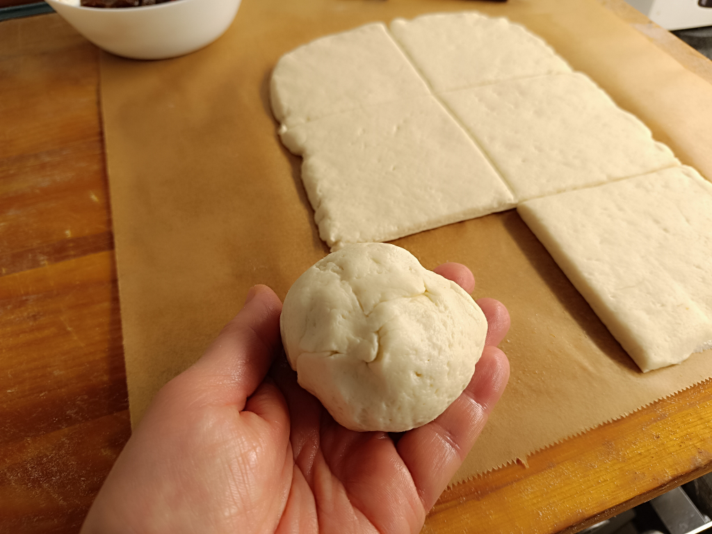 Ha 4 db nagyobb gombócot, akkor 20 x 20 cm-re, ha 6 db közepes méretűt, akkor 20 x 30 cm-es méretre kell nyújtani.