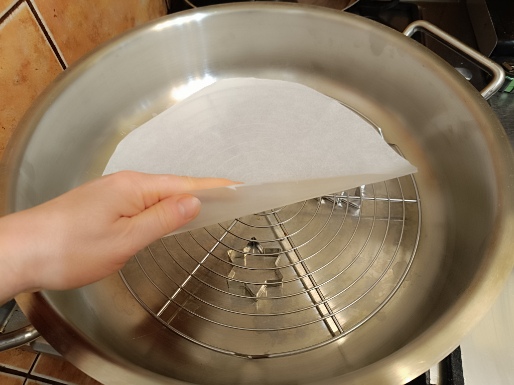 Nálam ez egy magas falú serpenyő volt, ebbe néhány kiszúróformát tettem, ami megemelte a csepegtető rácsot annyira, hogy a gombócok biztosan ne érjenek a vízbe.