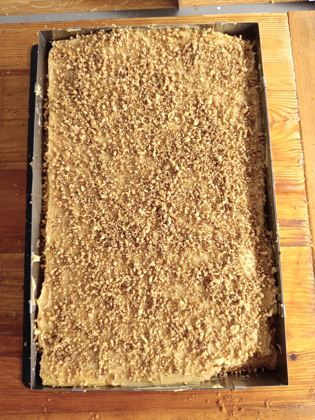 A tésztalapokat félbe vágjuk ( kb. 21 x 32 cm ) . Az elsőt megkenjük 100 g sötét mézes krémmel, majd elsimítjuk rajta a 145 g mascarponés krémet és megszórjuk 35 g durvára vágott dióval. Majd így folytatjuk a másik három lappal is a rétegezést. ( A legfelső lap is meg van kenve mindkét krémmel! )